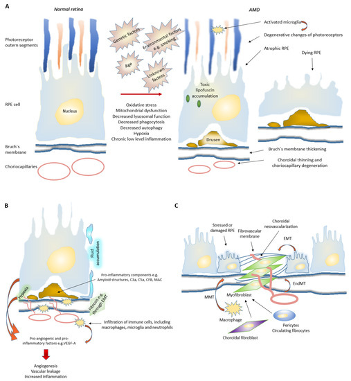 The transition from early to advanced AMD shares many features with a defective wound healing response resulting from underlying oxidative stress, degeneration and chronic inflammation (Figure 3). Subretinal fibrosis is a characteristic of the end-stage of AMD, resulting in a permanent vision loss. Wound healing will occur when injured tissue activates recruitment and activation of inflammatory cells and fibroblasts. In AMD, fibrosis is the product of defective and excessive wound healing response, which has unique characteristics as in nAMD it can originate from pre-existing neovascular membrane [60,61]. Multiple cell types, including fibroblast, fibrocytes, macrophages, RPE cells and endothelial cells, may potentially participate to this process. Matrix-producing mesenchymal cells in subretinal fibrotic lesions can for example originate from the retinal pigment epithelium and/or choroidal endothelial cells through epithelial–mesenchymal transition (EMT, Figure 3) and endothelial–mesenchymal transition (EndMT). Moreover, macrophages are able to transdifferentiate to myofibroblasts through macrophage-mesenchyman-transition (MMT). Majority of mesenchymal cells present in fibrotic lesions are myofibroblasts, which are not normally present in adult tissues [60,61]. It is believed that pro-inflammatory cytokines can promote differentiation and activation of myofibroblasts (e.g., EndMT and EMT). RPE cells and infiltrating macrophages are believed to be a major source of these cytokines. During EMT, EndMT and MMT cells experience several biochemical and morphological changes, they, for example, become more motile and adaptable. They lose cell-to-cell contacts and cell polarity, and further disengage from their basal surface and basement membrane in order to migrate and produce extracellular matrix components. For example, during EMT, the resulting mesenchymal cell leaves the epithelial layer and migrates into the retinal and subretinal RPE space and promotes fibrosis. Fibrosis in nAMD is considered to originate from neovascular membranes and to be a consequence of a fibrovascular scarring resulting from inflammation and hypoxia-driven angiogenesis [60,61,62,63]. Fibrosis may in some circumstances restore the protective barrier but can also progressively remodel and destroy normal tissue, leading to contracture and distortion of tissue architecture. As retinal visual function is built on highly organized anatomical layers and tightly coordinated cellular interactions, subretinal fibrosis will lead to a profound and often irreversible visual impairment. Currently, the pathogenetic mechanisms of subretinal fibrosis are poorly understood, and there is no therapy that would prevent excessive subretinal fibrosis [61]. It is hypothesized that during nAMD progression, RPE cells might avoid cell death and escape from the stressful microenvironment and oxidative insult via EMT, but the development of fibrosis is also linked to angiogenesis [57,60,64]. During an angiogenic switch, inflammatory cell recruitment is initiated, and as newly formed vessels are leaky. They contribute to retinal edema, hemorrhage and therefore further potentiate the pathological wound healing response (Figure 4) [65,66,67,68].