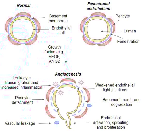 Illustration of a blood vessel in quiescent and angiogenic state. Cross-section of a capillary, fenestrated capillary and blood vessel during neovascularization. During vascular homeostasis, endothelial cells are connected by tight junctions and covered by both basement membrane and pericytes. Growth factors such as VEGF-A and ANG2 induce angiogenic switch that will lead to weakening of endothelial tight junctions, pericyte dropout and initiation of angiogenesis. Endothelial destabilization will further lead to vascular leakage and leukocyte transmigration. Abbreviations: VEGF, vascular endothelial growth factor; ANG, angiopoietin.