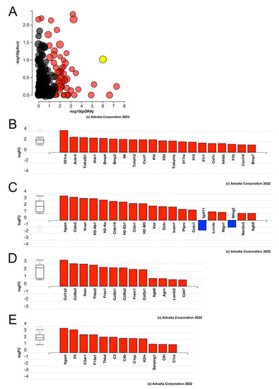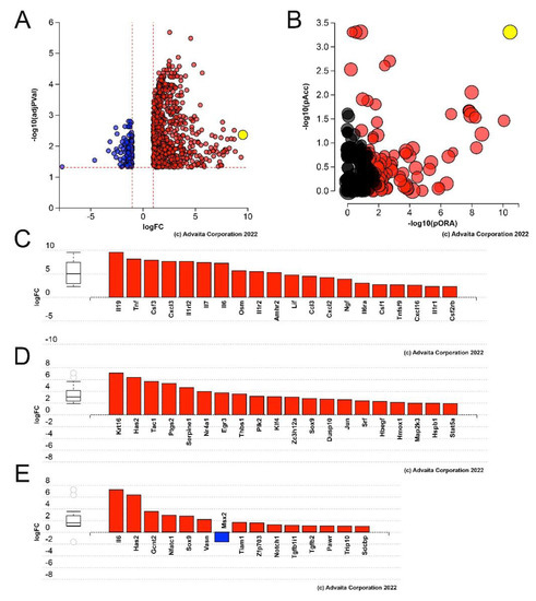 Advaita iPathway analysis of genes differentially expressed at 6 h PCS in LECs. (A) Volcano plot of genes (represented by either a blue dot for negative fold change or red dot for positive fold change) whose expression was statistically different in 6 h PCS LECs. Yellow dot represents Il19. (B) Impact analysis of the 6 h PCS DEGs predicting that the KEGG pathway “cytokine-cytokine receptor interaction” (p-value of 1.120 × 10−8) (yellow dot) is the most significantly impacted pathway. While other impacted KEGG pathways are represented by the other dots with black dots being non-significant KEGG pathways and red dots being significant KEGG pathways. (C) Bar graph showing which cytokine-cytokine receptor interaction genes are differentially expressed in LECs at 6 h PCS. (D) Bar graph showing the “epithelial cell migration” (p-value = 9.600 × 10−5) genes differentially expressed in 6 h PCS LECs. (E) Bar graph showing the DEGs implicated in the “epithelial to mesenchymal transition” (p-value = 0.003) pathway.