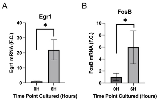 Investigation of the effect of 6 h ex vivo culture on Egr1 and FosB levels in LECs by qRT-PCR (A) Egr1 mRNA levels significantly upregulate in LECs after six hours of ex vivo culture (* p-value ≤ 0.01) (B) FosB mRNA levels signficantly upregulate in LECs after six hours of ex vivo culture (* p-value ≤ 0.025) FC-fold change from RNA levels obtained from LECs immediately after isolation.