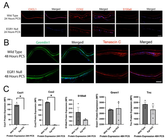 To investigate the role of Egr1 on the inflammatory and fibrotic response of LECs PCS, we first conducted a candidate gene approach. As previously described [18], we found that Cxcl1, Cox2 and S100a9 protein expression are all upregulated in wild type LECs at 24 h PCS while the upregulation of Cxcl1 and Cox2 was attenuated in Egr1KO mice. However, it appears that the inflammatory response is not globally attenuated as S100a9 expression upregulated normally in Egr1KO LECs at 24 h PCS (Figure 6A,C). Further protein levels for the fibrotic markers Gremlin1 and Tenascin C upregulate in wildtype LECs by 48 h PCS as previously reported [11,62] and this upregulation was not affected in Egr1KO LECs (Figure 6B,C) even though Egr1 has been reported to regulate the fibrotic response in other systems [63].