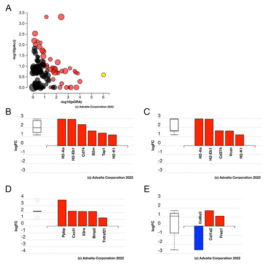 Advaita iPathway analysis of differentially expressed pathways/genes between 6 h Egr1KO and 6 h WT LECs. (A) Impact analysis of the DEGs suggest that the KEGG pathway map “antigen processing and presentation” (p-value = 4.147 × 10−6) (yellow dot) is the most significantly impacted pathway in the 6 h LECs. Other impacted KEGG pathways are represented by the other dots with black dots being non-significant KEGG pathways and red dots being significant KEGG pathways. (B) Bar graph showing the antigen processing and presentation genes that are differentially expressed in the 6H Egr1KO LECs. (C) Bar graph showing the cell adhesion molecules (p-value = 0.003) pathway of genes differentially expressed in the 6H Egr1KO LECs. (D) Bar graph showing the cytokine-cytokine receptor interaction (p-value = 0.003) pathway of genes differentially expressed in the 6H Egr1KO LECs. (E) Bar graph showing the ECM receptor interaction (p-value = 0.045) pathway of genes differentially expressed in the 6H Egr1KO LECs.