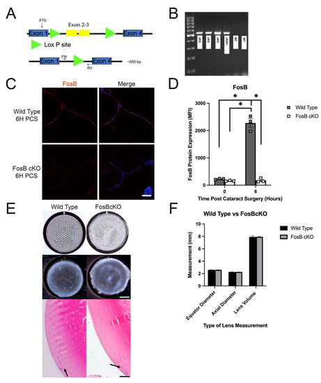 After the investigation of the Egr1KO LEC injury phenotype, the role of IETFs in regulating the response of LECs to lens fiber cell removal was still obscure. Thus, we investigated the role of FosB in the acute response of LECs to lens injury as it was one of the most upregulated genes (Table 1) and most upregulated IETFs (Table 3) at 6 h PCS. As FosB null mice exhibit nurturing defects [66], we generated mice lacking a functional FosB gene just in the lens (FosBcKO) by breeding a mouse carrying a floxed FosB allele [30] to a mouse containing the MLR10 lens specific cre recombinase transgene [31] (Figure 8A). The complete deletion of the floxed region of the FosB gene was validated by PCR analysis of DNA from mouse lens (Figure 8B) and further confirmation was validated at the protein level via immunofluorescence (Figure 8C,D). FosBcKO lens were the same size as the WT lens (Figure 8F), but similar to the Egr1KO lens, exhibit focal opacities visible by both brightfield and darkfield imaging (Figure 8E). Hematoxylin and eosin (H&E) staining demonstrated that FosBcKO lenses and WT lenses are histologically similar but FosBcKO appear to have a slight disorganization of the transition zone (Figure 8E).