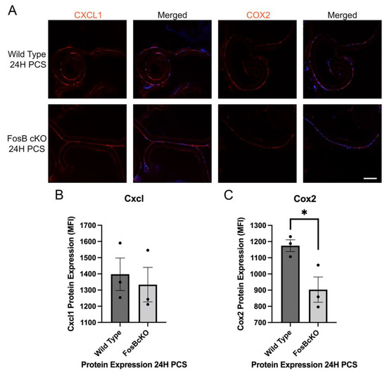 Inflammatory mediator protein expression in FosBcKO LECs compared to Wild Type at 24 h PCS. (A) Immunofluorescent staining for the proinflammatory mediators Cxcl1 and Cox2 (red) at 24 h PCS. Blue is DNA and Scale bar = 70 µm. (B) Quantification of Cxcl1 levels in LECs at 24 h PCS by immunofluorescence p = 0.97. (C) Quantification of Cox2 levels in LECs at 24 H PCS by immunofluorescence * represents p-value ≤ 0.01. The black dots in B & C represent the individual biological replicates for each bar in the bar graph.