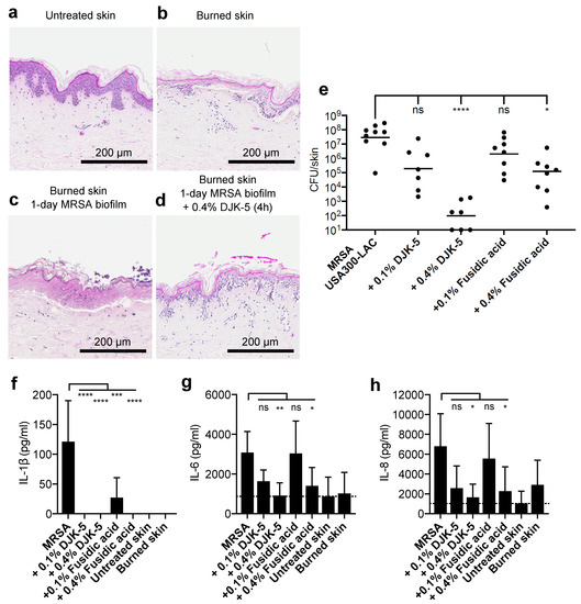 Antibiofilm activity of DJK-5 in the human burned skin MRSA biofilm model. Human surplus skin obtained post-breast reduction surgery was thermally challenged at 150 °C for 10 s and cultured at the air–liquid interface. Two million MRSA (USA300-LAC) were spotted on top of the burned skin and cultured for 24 h, followed by 4 h topical peptide treatment [0.1% (5 µg) or 0.4% (20 µg) DJK-5 or fusidic acid]. Skin cross sections were visualized by H&E staining (a–d). The colony count recovered from each skin sample was determined (e). Statistical significance comparing peptide treated skins to MRSA control was performed using the Kruskal–Wallis test, Dunn’s multiple comparisons test. Geometric mean of colony-count from 3 donors (7–9 replicates per conditions) was indicated. The concentrations of IL-1β (f), IL-6 (g), and IL-8 (h) in the skin culture medium was determined by ELISA. Error bars indicate mean with standard error in (f–h). Statistical significance of 5 replicates per condition from 3 donors was performed using one-way ANOVA, Dunnett’s multiple comparisons test (* p ≤ 0.05; ** p ≤ 0.01; *** p ≤ 0.001; **** p ≤ 0.0001).
