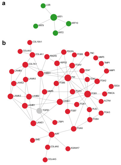 NetworkAnalyst depiction of modulation of skin barrier function and extracellular matrix turnover by MRSA biofilm infection in thermally-injured skin. Minimum protein–protein interaction networks of cornified envelope formation (a) and extracellular matrix organization (b) comparing MRSA biofilm infected skin with burned skin control using NetworkAnalyst. Red nodes denote upregulation. Green nodes denote downregulation.