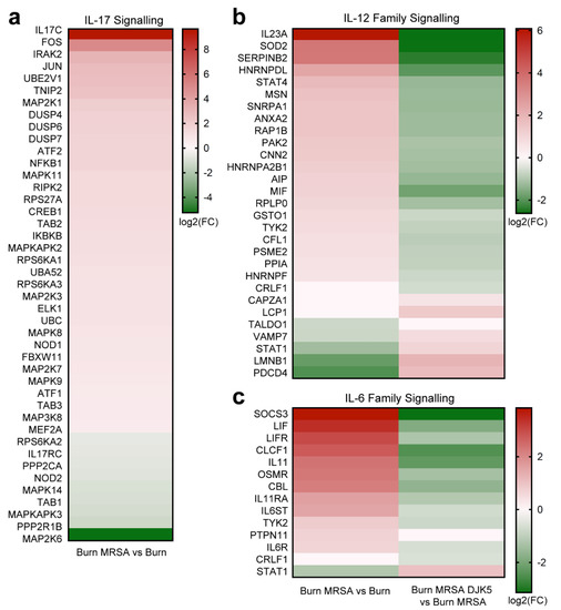 DJK-5 treatment downregulated IL-12 and IL-6 family interleukin responses in MRSA biofilm skin infection. Heatmaps of DE genes involved in the (a) IL-17, (b) IL-12 family (c), and IL-6 family signalling cascades in response to MRSA biofilm-induced skin inflammation with or without DJK-5 treatment. Color scale based on log2fold-change of DE genes with red indicating upregulation and green indicating downregulation.