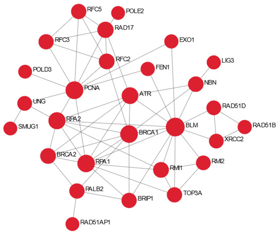 Network indicating DJK-5 enhancement of DNA repair functions in biofilm infected skin. A zero-order protein–protein interaction network of DE genes comparing DJK-5 treated vs. untreated MRSA biofilm skin infection using NetworkAnalyst. Red nodes denote upregulation.