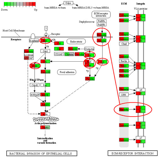 DJK-5 downregulated MRSA invasion of thermally damaged N/TERT skin. Modified KEGG Pathview graph of extracellular matrix–receptor interactions and bacterial invasion of epithelial cells. Left half of each gene compares MRSA infected burned skin to burned skin control, and the right half of each gene compares DJK-5 treated to untreated MRSA infection of burned skin. Red indicates upregulation and green indicates downregulation.