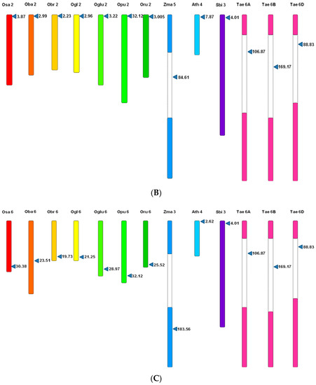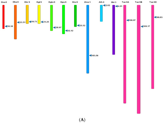 Our study revealed the loss of synteny in S. bicolor, Z. mays, and T. aestivum. In a similar kind of study involving the comparative genomics of the Ghd7 gene in ten Oryza species, Brachypodium distachyon, Sorghum, and Z. mays, it was observed that high gene collinearity existed among Oryza species, while collinearity was lost in non-Oryza spp. [84]. The Heading date 1 (Hd1) orthologous region, when compared between different Oryza spp. And Sorghum, exhibited the conservation of microsynteny in rice but disruptions in Sorghum [85]. Three ancient WGDs shaped the ancestral lineage of grasses [86]; however, O. sativa and S. bicolor experienced no subsequent polyploidization [87]. Although the ancestral karyotype of rice appears to be conserved among the common grass ancestors, with no major changes in the genome structure, most other species experienced additional genomic re-patterning processes; for example, maize represents an older tetra-ploidization event, during which it lost its homologous chromosome by reassembling homologous segments on newly formed chromosomes. Thus, WGD has differentially impacted the evolution and structure of grass genomes, suggesting that poly-ploidization, subsequent gene loss, and chromosome rearrangement played an important role in the diversification of grass genomes [88]. Such gene loss/gain and chromosome rearrangement account for the loss of microsynteny in distantly related non-Oryza spp. Even comparative analyses performed by different workers showed the extensive conservation of gene order, but the loss or gain of genes or genomic segments is only easily detected in closely related species and is important for genome organization and evolution [84].