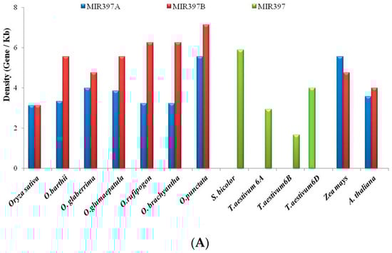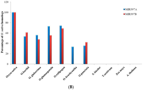 The homologs of MIR397 and MIR408 were identified in all the investigated Oryza spp. and other genera from the MIBASE database. In O. sativa subspecies indica, two homologs of MIR397, i.e., MIR397A and MIR397B, were identified. Additionally, using Oryza sativa MIR397 as reference, two homologs of MIR397, i.e., MIR397A and MIR397B, were also identified in all the wild relatives of rice, viz., O. barthii, O. brachyantha, O. glaberrima, O. glumaepetula, O. rufipogon, and O. punctata. In addition, two homologs of MIR397 (MIR397A and MIR397B) were identified in Z. mays and Arabidopsis. However, in S. bicolor and T. aestivum, a single homolog of MIR397 was identified (Figure 1A,B).