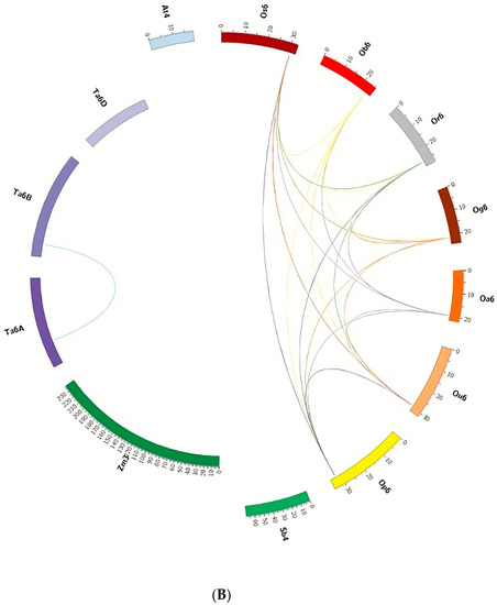 Out of 32 genes identified in the 100 kb region surrounding MIR397A in O. sativa, G-type lectin S-receptor-like serine/threonine-protein kinase At2g19130 was found to be conserved in all six rice species. Other O. sativa orthologs, viz., 50S ribosomal protein L-24 chloroplastic, Putative anthocyanidin reductase isoform X, and Beta-glucosidase 25 isoform X1, were found to be conserved in O. punctata, O. glumaepetula, O. rufipogon, O. barthii, and O. brachyantha. Wound responsive family protein was present in all Oryza spp., except for O. brachyantha. In O. sativa, orthologs such as Calcium binding protein PBP1-like and Armadillo/beta-catenin repeat protein like were conserved in O. punctata, O. glumaepetula, O. rufipogon, and O. barthii. Another gene, Serine/arginine repetitive matrix protein 1-like, was present in all Oryza spp., except for O. brachyantha and O. punctata; External alternative NAD (P) H-ubiquinone oxidoreductase B1, mitochondrial, was present in all Oryza spp., except for O. brachyantha and O. barthii; and Hypothetical protein OsI_24220 was present in all Oryza spp., except for O. brachyantha and O. glumaepetula. In O. sativa, orthologs (viz., Retro-transposon protein, putative, uncharacterized; DDIA protein like and Retro-transposon protein, putative; and Ty1-copia subclass) were conserved in O. rufipogon, O. barthii, and O. glaberrima. Similarly, O. sativa ortholog, Hypothetical protein DA122_O6g257503, was conserved in O. glumaepetula, O. rufipogon, and O. barthii while, Hepta-helical trans-membrane protein ADIPOR2-like was conserved in O. glumaepetula, O. rufipogon, and O. glaberrima. Hypothetical protein OsI_24221 was conserved in O. rufipogon and O. glaberrima; HGWP repeat containing like protein was only conserved in O. glaberrima, and Hypothetical protein OsI_24222 was only conserved in O. glumaepetula. So, from O. sativa to its wild relatives, to distantly related poaceae species, and further to non-poaceae dicot species, the overall microsynteny of the 100 kb regions was gradually lost. The conservation was completely lost in S. bicolor, Z. mays, and T. aestivum 6D, with no O. sativa homologs present in the 100 kb regions (Figure 5A,B).