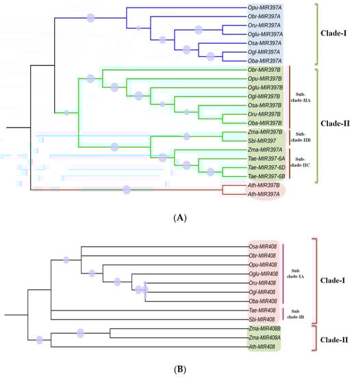 Phylogenetic relationship of MIR397 and MIR408 within poaceae members and Arabidopsis. (A) ML phylogenetic tree was constructed for the 22 MIR397 precursor and promoter (500 bp) sequences in O. sativa and its six wild relatives, S. bicolor, Z. mays, and T. aestivum. Arabidopsis was also included in the study as an outlier. Triangles denote the bootstrap values. Circles denote the bootstrap values ranging from 0.277 to 1.000. (B) ML phylogenetic tree was constructed for the 12 MIR408 precursor and promoter (500 bp) sequences in O. sativa and its six wild relatives, S. bicolor, Z. may, and T. aestivum. Arabidopsis was also included in the study as an outlier. Circles denote the bootstrap values ranging from 0.155 to 0.968. Osa—O. sativa; Oba—O. barthii; Ogl—O. glaberrima; ++++maepatula; Oru—O. rufipogon; Obr—O. brachyantha; Opu—O. punctata; Sbi—S. bicolor; Zma—Z. mays; Tae—T. aestivum; Ath—A. thaliana.