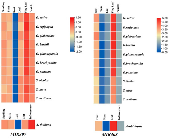 Differentially expressed MIR397 and MIR408 across different Oryza and poaceae species in tissue-specific manner. Expression pattern was obtained via qRT-PCR. Each block shows log2-fold expression in stem, leaf, root, and inflorescence.