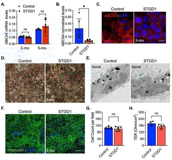 Molecular and morphological features of Control and STGD1 RPE cells. (A) Relative levels of ABCA4 mRNA by qRT-PCR from RPE cells for two (2)- and five (5)-months (mo) in culture. (B) Normalized ABCA4 protein levels of three-months control and STGD1 RPE cells homogenates (20 μg) by automated WES system (p = 0.025). STGD1 RPE cells have 85% reduction in ABCA4 levels compared to control. (C) Representative confocal microscopy images of three-months RPE cells fixed and stained for ABCA4 (red, custom-made antibody, generous gift from Dr. Hui Sun). DAPI (blue) stains the nuclei. Note a punctate distribution of ABCA4 throughout RPE cells of STGD1 compared to the control cells. Scale bar = 20 μm. (D–F) Representative images of two-months of control and STGD1 RPE cells by light (D), electron (E), and confocal (F) microscopy analysis. (D) RPE cells of both genotypes display similar cobblestone appearance and homogeneous pigmentation; Scale bar = 100 μm. (E) Control and STGD1 RPE cells developed as a monolayer and were polarized presenting apical microvilli (green arrow), melanosomes (white arrow), and nucleus (N). Scale bar = 2 μm. (F) Phalloidin staining F-actin filaments (green) evidences a well-defined hexagonal cell shape for both STGD1 vs control RPE cells. DAPI (blue) stains the nuclei. Scale bar = 20 μm. (G) Bar graph shows similar number of cells per view field (140 μm2) between the control and STGD1 RPE cells (two-months in culture). (H) Histogram shows the transepithelial resistance (TER) measured across monolayers of control and STGD1 RPE cells (three-months in culture). Note: All RPE cells were grown in culture with conditioned medium without retinoids. In (A,B,G,H) data presented as mean ± SD; Statistics analysis using Student’s t-test; ns = not significant; * p < 0.05; n = 4–6 filter/transwell per genotype.