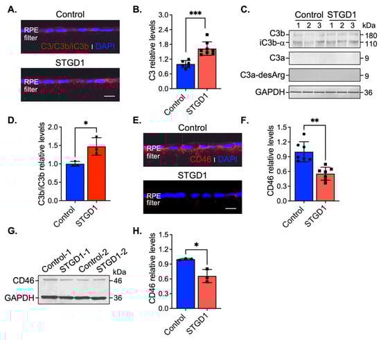 Stimulation of C3 activity by bisretinoids has been shown in vivo and in vitro [,,]. Here, we assessed C3 components and the complement negative regulatory proteins, CD46, CD59, and CFH by immunohistochemistry and immunoblotting at three-months in human-derived RPE cultured cells. On sections, C3 immunolabeling appeared throughout the RPE cells and was approximately two-fold higher in STGD1 versus control RPE cells (Figure 4A,B). Elevated C3b/iC3b breakdown fragments were further confirmed by quantitative immunoblot analysis (Figure 4C,D). Using fixed sections and RPE cell homogenates, C3a, a short-lived soluble fragment released after C3 fragmentation, was investigated with an antibody against its more stable form, C3a-desArg along with its C3a cognate membrane-bound receptor C3aR. While the C3a fragment was not detected in the RPE cells (Figure 4C), immunoblotting and immunostaining for its cognate receptor, C3aR, showed similar distribution and levels in control and STGD1 RPE cells (Figure S5A–C). C5aR levels were also similar in control and STGD1 RPE cells (Figure S5B,D), suggesting that the C5a/C5aR signaling pathway downstream of C3a/C3aR is also not activated. Next, we determined the levels of CD46, a membrane-bound, early-stage inhibitor of C3 convertase. CD46 appeared to localize predominantly on the basolateral side of the RPE cells. By confocal microscopy, CD46 immunostaining was notably diminished and pixel intensity quantification of CD46 showed approximately two-fold reduction in STGD1 versus human control RPE cells (Figure 4E,F). Further, CD46 levels in STGD1 RPE cells were only ~65% of the levels in control RPE cells by quantitative immunoblotting (Figure 4G,H). Unlike CD46, the cellular distribution and levels of CD59, another membrane-bound complement regulatory protein that inhibits the final step of the C3 cascade, were similar in the STGD1 and control RPE cells (Figure S5E,F). By quantitative immunoblotting, we measured levels of complement factor H (CFH), a major soluble complement regulatory protein, in the media of cultured RPE cells. Levels of CFH, along with unrelated secreted protein PEDF, were also similar between STGD1 and control RPE cells (Figure S5G,H). Taken together, these data suggest a primary deficiency of C3 convertase inhibition during the early complement amplification phase on the surface of STGD1 RPE cells.