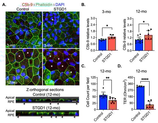 Excessive C3 hydrolysis and increased C3b opsonizing affinity on the plasma membrane due to C3 convertase activity are responsible for the assembly of terminal complement complex C5-C9 []. We assessed formation of this terminal complex on the surface of STGD1 and control RPE cells at different times in culture by confocal microscopy with an antibody against MAC (C5b-9 complex). We observed 1.2- and two-fold increased MAC levels on the STGD1 versus control RPE cells at three and 12 months in culture, respectively (Figure 5A,B and Figure S6A). Orthogonal images obtained from z-stacked optical sections, from the apical side, showed that MAC deposition was predominantly on the basolateral poles of these cells and evidenced its internalization more abundantly in the STGD1 RPE cells (Figure 5A). Additionally, MAC localization was confirmed in the STGD1 and control RPE cells using an antibody against peropsin, an integral membrane protein expressed only in the apical microvilli of RPE cells (Figure S6B) []. Furthermore, the en-face view of phalloidin-staining apically distributed actin filaments showed an advanced dysmorphism (discontinued lines and wider cell size, indicated by stars, respectively) in the aged STGD1 versus control RPE cells (Figure 5A and Figure S6A). These changes after 12-months in culture were mirrored by a decline in junctional complexes between cells, reflected by a ~35% loss of cell number and ~80% reduction of TER in the STGD1 versus control RPE cultures (Figure 5C,D).