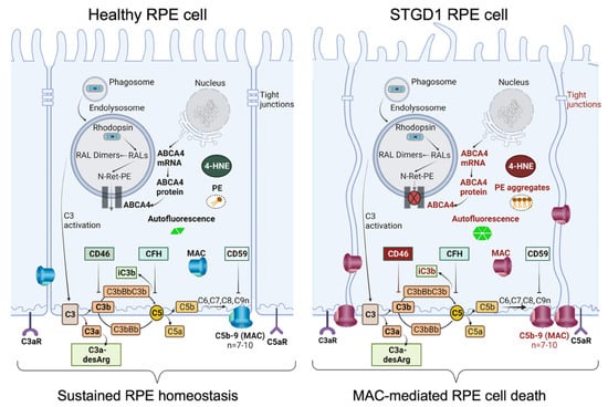 Schematic diagram summarizing our data of healthy RPE (left) and STGD1 RPE (right). ABCA4-deficiency in STGD1 RPE cells results in the ongoing intracellular accumulation of autofluorescent-lipofuscin material, including phosphatidylethanolamine (PE) aggregates, and augmented C3 complement cascade on the basolateral side of plasma membrane of RPE cells. An early key pathological feature of STGD1 RPE cells is the improper inhibition of C3 convertase by the CD46 complement negative regulator protein. Consequently, CD46 insufficiency in STGD1 RPE cells causes abnormal formation of complement terminal complex (C5b-9) on RPE plasma membrane. With more C9 addition to the C5b-9, the terminal complex destabilizes the plasma membrane by forming a lytic pore which causes loss of the RPE cells in the STGD1 patients. Diagram created with BioRender.com.