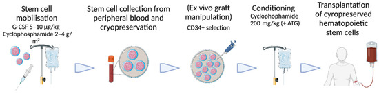 As previously highlighted, autologous HSCT is preferred over allogeneic HSCT for the treatment of autoimmune diseases due to the less complicated procedure [32,33]. Autologous HSCT consists of several steps (Figure 1): First, stem cells have to be harvested from the patient. In autoimmune diseases, it is established to use peripheral blood stem cells (PBSC) mobilized by G-CSF. As disease flares have been reported during G-CSF treatment in patients with multiple sclerosis, rheumatoid arthritis, and systemic lupus erythematosus [34,35,36], cyclophosphamide with a dose of 2–4 g/m2 is applied before G-CSF treatment with 5–10 µg/kg [27,35]. This regime was also used in the reported trials of autologous HSCT for CD [37,38,39,40,41,42,43,44,45,46,47,48]. To avoid combined immunosuppression, immunomodulators and biologics for the treatment of CD should be discontinued as early as possible before cyclophosphamide application to reduce the risk of infections and to prevent interference with PBSC mobilization. The minimum yield of hematopoietic stem cells (CD34+ cells) is 2 × 106/kg CD34+ cells to grant sufficient engraftment after high-dose chemotherapy, as suggested by the European Group for Blood and Marrow Transplantation (EBMT) [49].