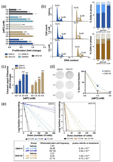 Melatonin (aMT) decreased viability and clonogenic ability, leading to cell cycle arrest and cell death by apoptosis in GBM. (a) Proliferation of five patient-derived cell lines after 48 h of treatment with vehicle or aMT. (b) Representative histograms showing the distribution of cell cycle phases and quantification of GBM1A and QNS120 after 48 h of treatment with the vehicle or aMT. (c) Apoptotic cell death is indicated by the ratio of activated caspase-3/7 over Hoechst. GBM1A and QNS120 were treated for 96 h with the vehicle or aMT. (d) Colony-formation assay in GBM1A and QNS120 with vehicle or aMT. Representative colonies are shown; the graph summarizes the survival fraction. (e) Limiting dilution assay shows the proportion of nonresponding cells. The graph shows a log-fraction plot (each line represents the log of the active cell fraction; dotted lines represent the 95% CI). * p < 0.05; *** p < 0.001.
