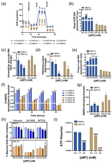 Melatonin (aMT) differentially disturbs GBM mitochondrial metabolism. (a) Oxygen consumption rate (OCR) kinetics and (b) basal OCR for GBM1A and QNS120 after 96 h of treatment with the vehicle or aMT. (c) Intracellular pyruvate in GBM1A and QNS120 after 96 h of treatment with the vehicle or aMT. (d) Pyruvate dehydrogenase (PDH) protein relative expression after 96 h of treatment with the vehicle or aMT. (e) Proton leak from GBM1A and QNS120 after 96 h of treatment with the vehicle or aMT. (f) ROS levels in GBM1A and QNS120 during treatment with the vehicle or aMT. (g) Glucose-6-phosphate dehydrogenase (G6PDH) activity in GBM1A after 48 h of treatment with the vehicle or aMT. (h) Percentage of maximal OCR after inhibition with etomoxir, UK5099, or BPTES for GBM1A and QNS120 treated for 96 h with the vehicle or aMT. (i) ATP depletion in GBM1A and QNS120 after 96 h of treatment with the vehicle or aMT. * p < 0.05; ** p < 0.01; *** p < 0.001.