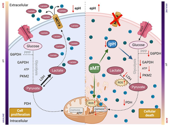 N-Acetyl-5-methoxytryptamine (aMT; melatonin) is a versatile and pleiotropic indolamine. The role of melatonin in cancer has been studied in recent years because of its oncostatic effects [7,8]. Despite the well-known effects of aMT as an antioxidant [9], our team and others have described the role of melatonin as an inducer of reactive oxygen species (ROS) [10,11] in different cancer types at pharmacological concentrations [12,13]. Although ROS are widely believed to directly trigger apoptotic mechanisms, controversy remains about how these free radicals are generated and if they are the only mechanism underlying the anticancer effects of melatonin. Little research has focused on the regulatory effects of melatonin on the intracellular pH of cancer cells [14]. Here, we describe for the first time the modulatory effects of melatonin on GBM intracellular pH and consider the implications of these findings on cancer metabolism and the fate of GBM cells.