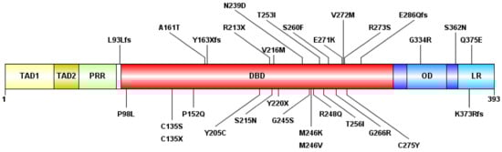The schematic representation of the p53 protein structure and the detected mutations. The following domains are shown: transactivation domain 1 (TAD1) (1–40 amino-acid, AA), TAD2 (40–60 AA), proline-rich region (PRR) (60–90 AA), DNA-binding domain (DBD) (94–312 AA), oligomerization domain (OD) (323–355 AA), and lysin-rich C-terminal tail (LR) (364–393 AA). “fs”: type of AA change is a frameshift, “X”: termination codon.