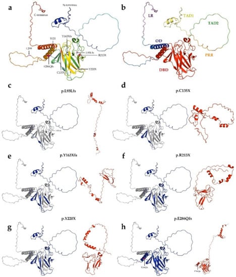 Structure of p53 Robetta prediction of truncated proteins. (a): Tertiary structure of wild-type p53 protein. The structure was generated by AlphaFold. (b): Overall structure and domain organization of wild-type p53. (c–h): The wild-type protein was colored blue for the length of its aligned mutant-type (red) counterpart. (c): p.L93Lfs (121 AA) protein, (d): p.C135X (134 AA), (e): p.Y163Xfs (162 AA), (f): p.R213X (212 AA), (g): Y220X (219 AA), (h): p.E286Qfs (299 AA).