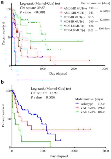 The prognostic significance of TP53 mutations depends in part on their variant allele frequency (VAF), with less frequent clones having a less adverse impact [,]. Patients with a lower VAF had better survival, according to the literature, TP53 mutant cases with a VAF > 23% had an increased risk of death compared to wild-type patients, while cases with a VAF ≤ 23% had a similar OS to wild-type patients []. Our results revealed a higher average VAF in AML-MR and MDS-IB groups as compared to MDS-LB cases (34.12% and 35.59% vs. 22.83%, respectively).
