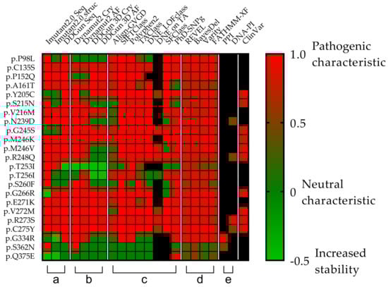 Comparison of the clinical relevance of the detected p53 mutations. Each row represents a p53 missense mutation, yet the columns represent protein stability predictions (a,b), different scoring systems (c,d), and interaction affinity studies (e) universally denoted by a color transition from green to red and corresponding value from 0 to 1, where the two endpoints are green = non-pathogenic and red = pathogenic). (a,b) Seq means sequence basis methods (I-Mutant2.0 seq, DDGun seq), Cry means wild-type protein crystal structures (I-Mutant2.0 Cry, DynaMut2 Cry, DDGun 3D Cry), and AF means protein structures generated with AlphaFold AI (DynaMut2 AF, DDGun 3D AF). Stability change was considered to be decreasing, if it was less than −0.5 kcal/mol (score 1, red) and increasing (score −0.5, light green) if it was higher than 0.5 kcal/mol, otherwise, the stability change of the mutation was considered as neutral (score 0, green). (c,d) Align-GVG represents the original C0 to C65 order on a color scale, where 0 = C0 and 1 = C65. SIFTCLass uses the pathogenicity class defined by Sift class, in the table 0 = benign, 1 = damaging. Polyphen2 class Benign = 0, possibly damaging = 0.5, probably damaging = 1. TAClass uses TransactivationClass classification, which divides variants into three functional categories “functional”, which is 0 in the figure, “partially functional” with a value of 0.5, and “non-functional” with a value of 1. DNE LOFclass indicates whether the mutation has a dominant-negative effect and loss-of-function effect (if yes, the value is 1, if no, the value is 0). DNE on TA uses scoring categories, whether the mutant has a dominant-negative (DN) effect on the transactivation of wild-type p53 (if the answer is “yes” the value is 1 if “moderate” the value is 0.5). SFClass (Structure Function Class) classifies the structural functionality of the mutant into non-functional (score 0) and functional (score 1). Phd_SNPg predicts human deleterious SNPs in the human genome and is a binary classifier for predicting pathogenic variants in the coding and non-coding regions (0 = non-pathogenic and 1 = pathogenic). REVEL scores for an individual missense variant range from 0 to 1, with higher scores reflecting a greater likelihood that the variant is disease-causing. BayesDel’s original numbering scheme ranging from −1.29334 to 0.75731 is represented as 0–1, where 0 = −1.29334 and 0.75731 = 1. Varity and FATHMM-XF score is a predictor of variants pathogenicity scoring from 0 to 1, as well. (e) PPI shows the protein–protein interactions affinity changes with the value of 0.5 if the rate of decrease was below 0.5 kcal/mol and 1 if it was higher. DNA-PI shows the affinity change of the interaction between DNA and p53 protein. The score is 1 (red) when the decrease is less than −0.5-0.5 if not. ClinVar column filled in based on the ClinVar database. ClinVar is displayed for comparison and to show that many of the TP53 mutations in the database are missing or not classified. Only those variants were assigned a value as pathogenic (score 1) or likely pathogenic (0.8), even “Conflicting interpretations of pathogenicity” mutants with “Uncertain significance” and variants not found in the database were not assigned a value Our table was based on data from the TP53 Database supplemented with scores from Varity and FATHMM-XF. Black squares were shown as missing information in the databases.