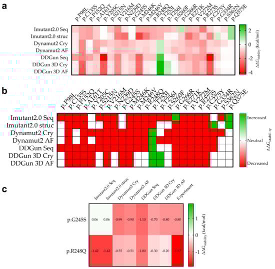 Stability change (ΔΔGstability) due to mutation of p53 mutant proteins and experimental comparison. (a): The specific calculated results are shown in red (decreasing stability) and green (increasing stability). The figure shows for which mutations we calculated decreasing and increasing ΔΔGstability in mutant proteins in kcal/mol as a result of the mutations. (b): The stability change was considered as decreasing if it was less than −0.5 kcal/mol (red) and increasing (green) if it was greater than 0.5 kcal/mol, otherwise the stability change of the mutation was considered to be neutral (white). (c): Two mutations p.G245S and p.R248Q that have been measured experimentally so far and their predictive comparison (see Section 2).