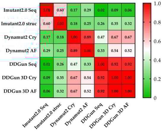 Pearson correlation matrix of the seven prediction methods. None of the results obtained by the I-Mutant 2.0 analyses showed a correlation of (<0.5 Pearson’s r was observed) with the results of other methods. The cells of the table are colored based on Pearson’s r values (see color scale). The other sequence-based method DDGun seq even with its DDGun pairs is highly correlated with DynaMut2 methods not reaching 0.5.
