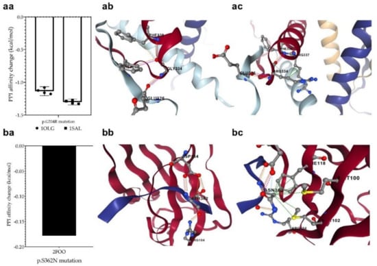 Changes in protein-protein interactions (PPI) upon p.G334R (aa) and p.S362N (ba) mutations. The 1OLG, 1SAL, and 2FOO are the PDB identifiers of the studied crystal structures (see Section 2). P.G334R mutation was supposed to affect interactions between the monomers of tetrameric p53, while p.S362N was considered to affect the interaction of p53 and USP7/HAUSP proteins. (ab): PPI between wild-type chains, (ac): PPI between wild-type and mutant chain, (bb): PPI between wild-type protein chain and USP7, (bc): PPI between mutant protein and USP7. The different dash dots between the residues indicate the type of interactions. Pink: clashes; light blue: van der Waals; red: hydrogen bond; yellow: ionic bond; green: hydrophobic; orange: polar.