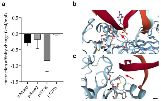 In almost all cases, the mutations were predicted to weaken the interaction between p53 and DNA. The most remarkable decrease was observed for the p.R273S (−0.8370 kcal/mol), while only a moderate change was calculated for the p.C275Y mutation (−0.03867 kcal/mol).