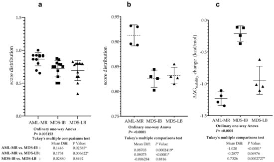 Four prediction methods were used to analyze the differences in structural stabilities between the three AML/MDS groups. To perform this analysis, we used DynaMut2 Cry (crystal structure-based) and AF (AlphaFold), DDGun 3D Cry, and AF. The I-Mutant2.0 Seq, I-Mutant2.0 struc, and DDGun Seq were not included in the analyses because of the low Pearson r value in the correlation matrix (Figure 7). A one-way ANOVA (Figure 10c) revealed that there was a statistically significant difference in mean score between at least two groups (F(2, 9) = [44.44], p ≤ 0.0001). The Tukey’s multiple comparisons test found that the mean value of the score was significantly different between AML-MR vs. MDS-IB (p < 0.0001, 95% C.I. = [−1.332–−0.7087]) and MDS-IB vs. MDS-LB (p 0.0003, 95% C.I. = [0.4210–1.044]). There was no statistically significant difference between AML-MR vs. MDS-LB (p = 0.0698).