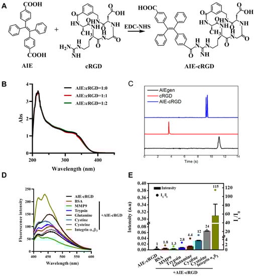 The recombinant integrin protein (R&D systems, Minneapolis, MN, USA) was dissolved in water, diluting to obtain the integrin solution (100 μg/mL). The 1 mg bovine serum albumin (BSA) (Amresco, Houston, TX, USA) was dissolved in 1 mL PBS, and diluted to 100 μg/mL. Then, 5 μL AIE-cRGD or (and) BSA was added to 300 μL PBS, then UV absorption intensity was measured by double beam ultraviolet at 230 nm.