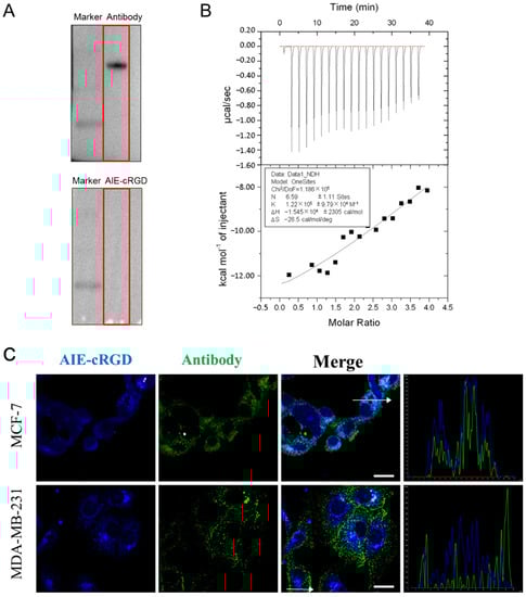(A) Western blotting test for integrin αvβ3 proteins. (B) The ITC data for measurement of reaction rate of AIE-cRGD (100 μM) with protein integrin αvβ3 (5 μM). (C) Colocalization coefficients of AIE–cRGD and anti-integrin antibody in MCF-7, MDA-MB-231. Bar = 20 µm. The cells were incubated with AIE–cRGD (100 μg/mL), followed by further incubation with anti-integrin αvβ3 antibody overnight at 4 °C. The curve graph is a result of measuring the intensity of two kinds of fluorescence at random position of white arrows in the merge diagram of two cells.