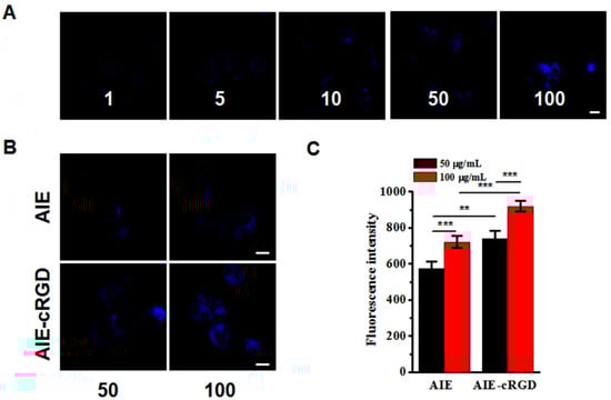 Concentration of probe for labeling the living cells. (A) Confocal images of MDA-MB-231 cells after incubation with different concentrations AIE–cRGD (1, 5, 10, 50, 100 μg/mL, in PBS) at 4 °C overnight. (B) Confocal images of MDA-MB-231 cells. Incubated with AIE and AIE–cRGD with different concentrations (50 μg/mL, 100 μg/mL μg/mL), respectively. (C) MDA-MB-231 cells fluorescence intensity statistical data. The cells were incubated with AIE and AIE–cRGD (50 μg/mL, 100 μg/mL) at 4 °C overnight, respectively. *** p < 0.001, ** p < 0.01, represented significant differences compared with the control group. Bar = 20 µm.