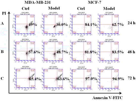 Employing the poly-HEMA-induced method [], we simulated cancer cells that had detached from the ECM and acquired the ability to resist anoikis as the model cells. The control cells were cultured in low adhesion plates for 24, 48, or 72 h, and then we detected their ability to resist anoikis by flow cytometry. The results show that the model MDA-MB-231 cells had a low apoptosis rate compared with control cells. At 24 h, the apoptosis rates of the control and model groups were 49.0% and 30.0%, respectively; at 48 h they were 57.6% and 48.7%; and at 72 h, apoptosis rates were similar at 65.4% and 63.6% (Figure 4). These values indicated that the model cells could resist anoikis for 24 h. Although the apoptosis rate of MCF-7 model cells was lower than the control cells, there was no significant difference. Then, we collected model cells from poly-HEMA plates for reculture on normal plates. After 2 h, the cellular morphology changed from gathered spheres in suspension to fusiform and began to attach and grow on the bottoms of culture plates (Figure S2). This verified that the model cells re-colonized and grew by adhering to the culture plate. Collectively, our results showed that model cells could successfully resist anoikis, so they were used in subsequent experiments.