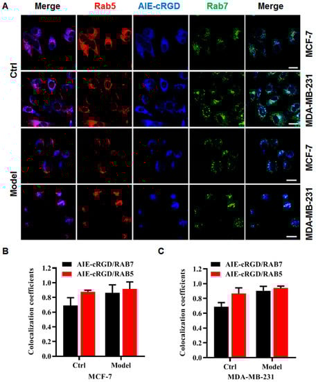 The distribution of integrin clusters in cancer cells. (A) Confocal fluorescence microscopy images of MCF-7, MDA-MB-231 cells with different treatments stained with AIE–cRGD, Rab5, Rab7, respectively. Colocalization coefficients of AIE–cRGD with RAB5 or RAB7 in control cells and model cells of MCF-7(B), MDA-MB-231(C) cells, respectively. Bar = 20 µm.