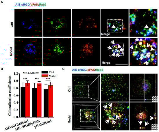 Assaying the resisting anoikis in model cells using the AIE-cRGD. (A) Confocal images of MDA-MB-231 cells stained with AIE–cRGD (blue), pFAK (red), and Rab5 (green), respectively. The model cells were cultured in poly-HEMA-coated six-well plates for 24 h, whereas the control was in untreated six-well plates. The white arrows showed the colocation of the AIE-cRGD, pFAK, and Rab5. Bar = 20 µm. (B) Colocalization intensity statistic of AIE–cRGD and Rab5, AIE–cRGD and pFAK, and pFAK and Rab5. *** p < 0.001 represent significant differences compared with the control group. (C) Confocal 3D images of MDA-MB-231 stained with AIE–cRGD, Rab5, and pFAK. The white arrows showed the colocation of the AIE-cRGD, pFAK, and Rab5. Bar = 20 µm.