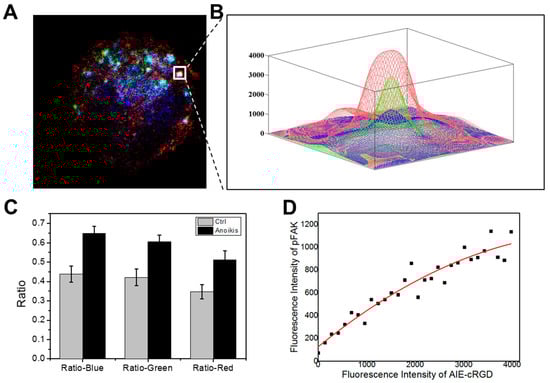 Image analysis. (A) Example of three-color high-resolution images collected with the confocal microscope. AIE–cRGD are pseudo-colored in blue, pFAK is pseudo-colored in red, and Rab5 is pseudo-colored in green. (B) Close-ups show the fluorescence intensity of the three colors in individual endosomes. (C) Comparison of the colocalization of three colors in the proportion of the three colors channels, respectively, between the control group and model cell group. (D) Statistics of the relationship of fluorescence intensity between the AIE–cRGD and the pFAK in model cell group. The solid black squares represent pixels in the detection area. The red line in the upper left corner is the picture after fitting the fluorescence point diagram and the linear relation formula.