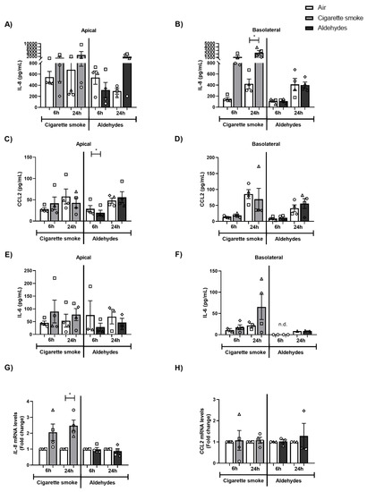 - Dwivedi, A.M.; Upadhyay, S.; Johanson, G.; Ernstgard, L.; Palmberg, L. Inflammatory effects of acrolein, crotonaldehyde and hexanal vapors on human primary bronchial epithelial cells cultured at air-liquid interface. Toxicol. Vitro 2018, 46, 219–228. [Google Scholar] [CrossRef]