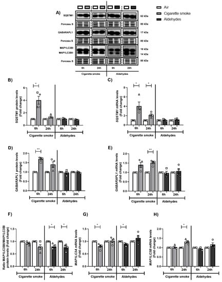 3.4. Altered Abundance of Molecules Associated with Autophagy Following CS or Aldehyde Exposure