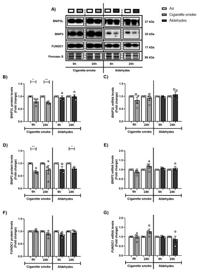 - Zhang, M.; Shi, R.; Zhang, Y.; Shan, H.; Zhang, Q.; Yang, X.; Li, Y.; Zhang, J. Nix/BNIP3L-dependent mitophagy accounts for airway epithelial cell injury induced by cigarette smoke. J. Cell Physiol. 2019, 234, 14210–14220. [Google Scholar] [CrossRef] [PubMed]