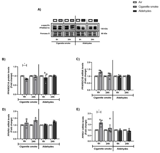3.6. Alterations in the Expression of Proteins and Genes Involved in Mitochondrial Biogenesis in Response to CS