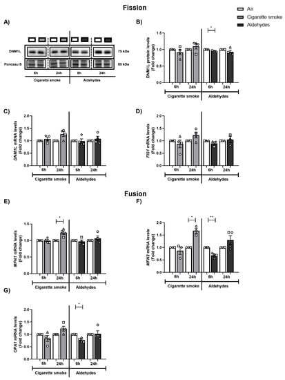 3.7. CS and Aldehydes Affect the Abundance of Mitochondrial Fission and Fusion Regulators