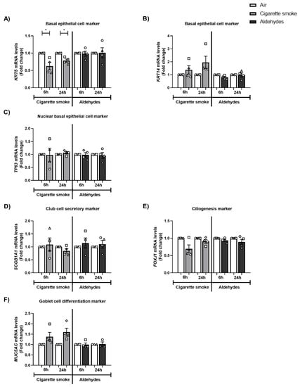 - Schamberger, A.C.; Staab-Weijnitz, C.A.; Mise-Racek, N.; Eickelberg, O. Cigarette smoke alters primary human bronchial epithelial cell differentiation at the air-liquid interface. Sci. Rep. 2015, 5, 8163. [Google Scholar] [CrossRef] [PubMed]