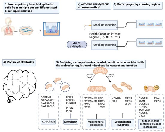 Tulen, C.B.M.; Duistermaat, E.; Cremers, J.W.J.M.; Klerx, W.N.M.; Fokkens, P.H.B.; Weibolt, N.; Kloosterboer, N.; Dentener, M.A.; Gremmer, E.R.; Jessen, P.J.J.; et al. Smoking-Associated Exposure of Human Primary Bronchial Epithelial Cells to Aldehydes: Impact on Molecular Mechanisms Controlling Mitochondrial Content and Function. Cells 2022, 11, 3481. https://doi.org/10.3390/cells11213481
