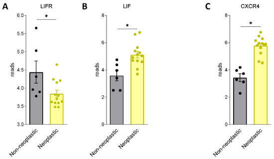 LIF and LIFR show an opposite regulation in human PDAC. RNA-seq analysis of non-neoplastic and neoplastic mucosa of PDAC from GSE196009 repository. Each dot represents a patient. Data shown represent the gene profile expression of (A) LIFR, (B) LIF, chemokine receptor type 4 (C) CXCR4. Results are the mean ± SEM of 6 (Non-neoplastic) and 13 (Neoplastic) samples per group. * p < 0.05.